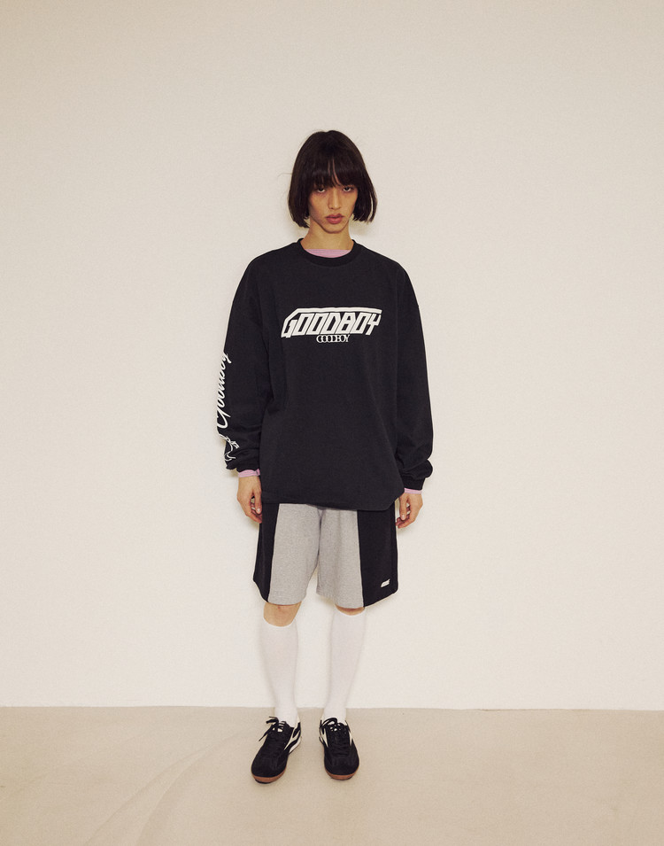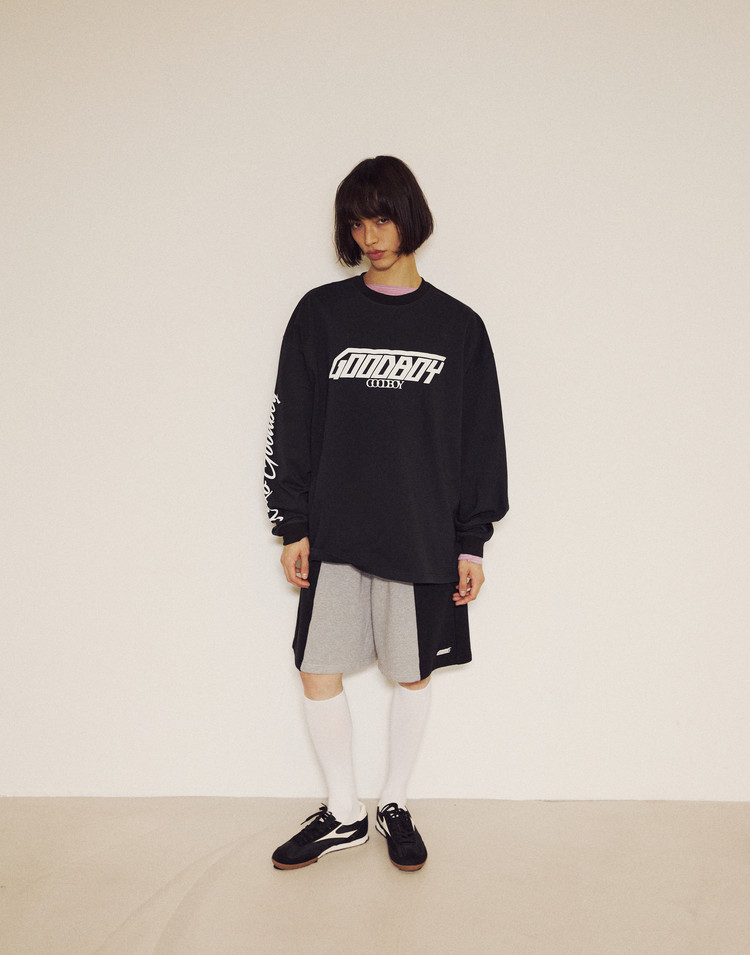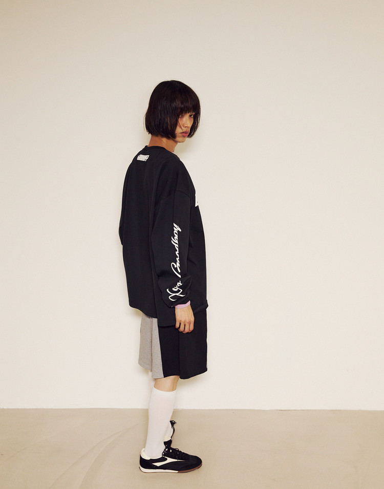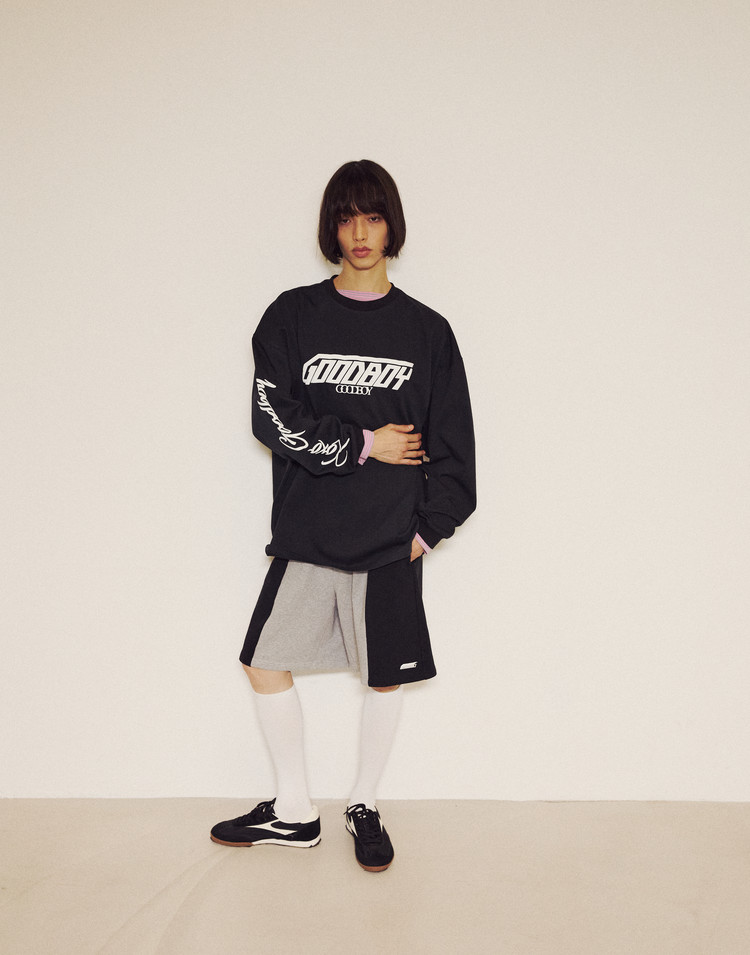 THE OVERSIZED FIT SHORTS PAIR WITH THE 3-BUTTON NEW SYMBOL SWEATSHIRT AS A SET. SIDE COLOR BLOCKING ADDS A POINT, AND COLORFUL STOCKINGS BRING A SEXY YET CASUAL VIBE